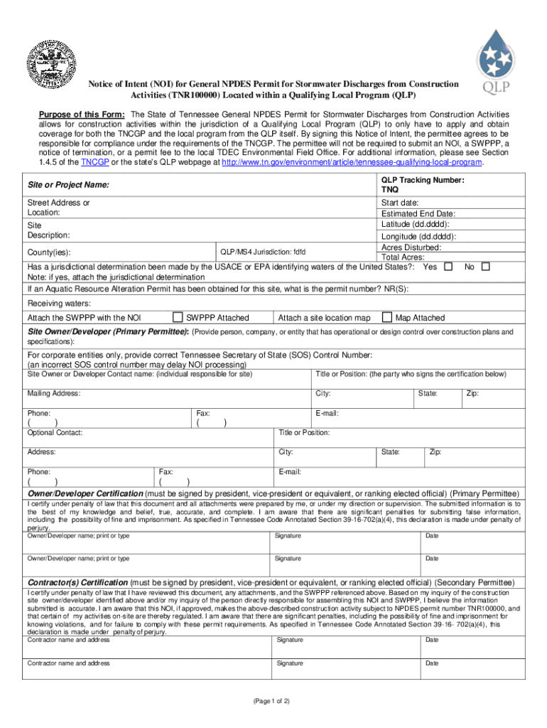 This form is used to apply for coverage under the State of Tennessee General NPDES Permit for Stormwater Discharges from Construction Activities, designed for construction activities within a Qualifying