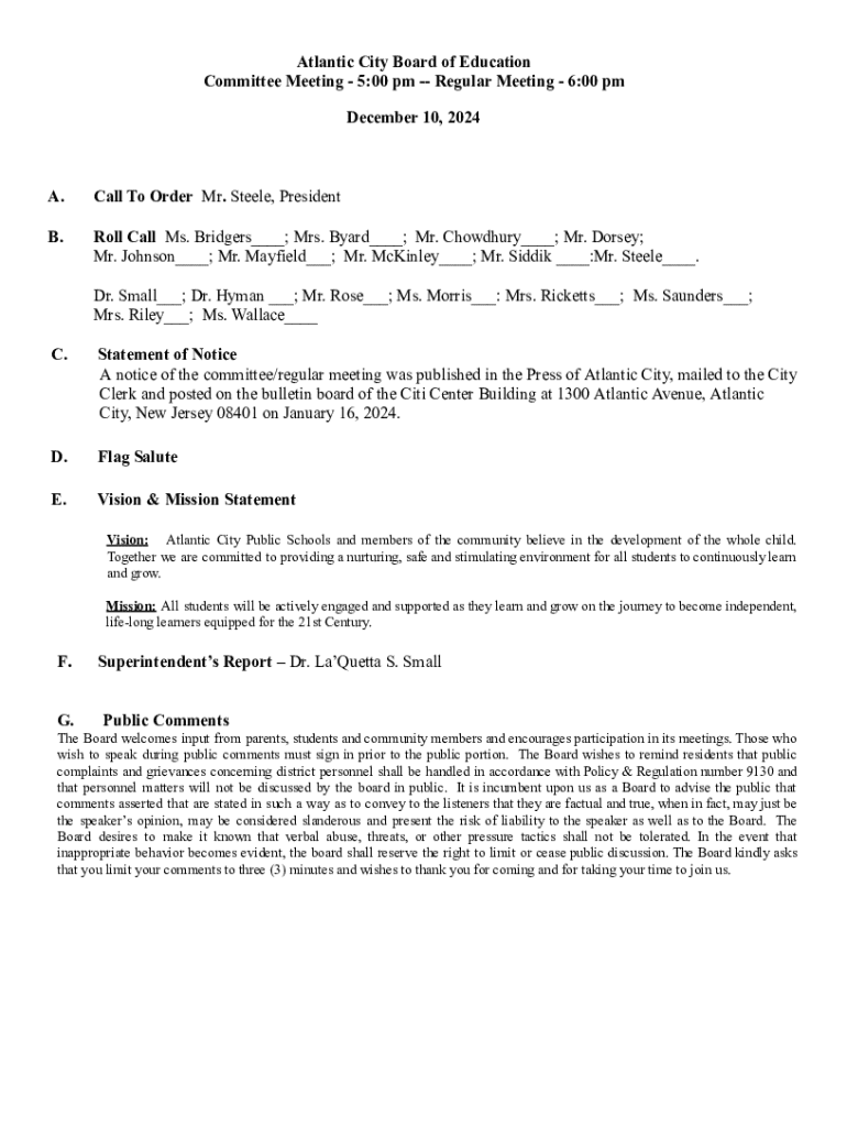 Atlantic City Board of Education Committee Meeting 5:00 pm Regular Meeting 6:00 pm December 10, 2024A.Call To Order Mr. Steele, PresidentB.Roll Call Ms. Bridgers___; Mrs. Byard___; Mr. Chowdhury___;