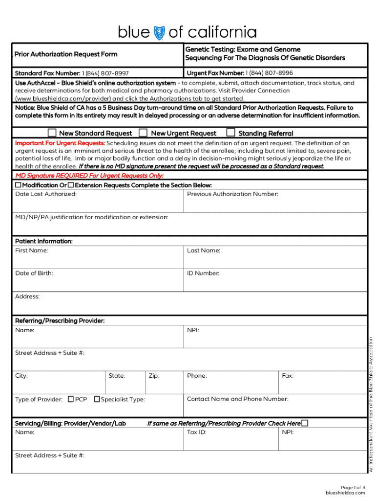 This form is used to request prior authorization for genetic testing including exome and genome sequencing to diagnose genetic disorders. It outlines the required information and documents needed