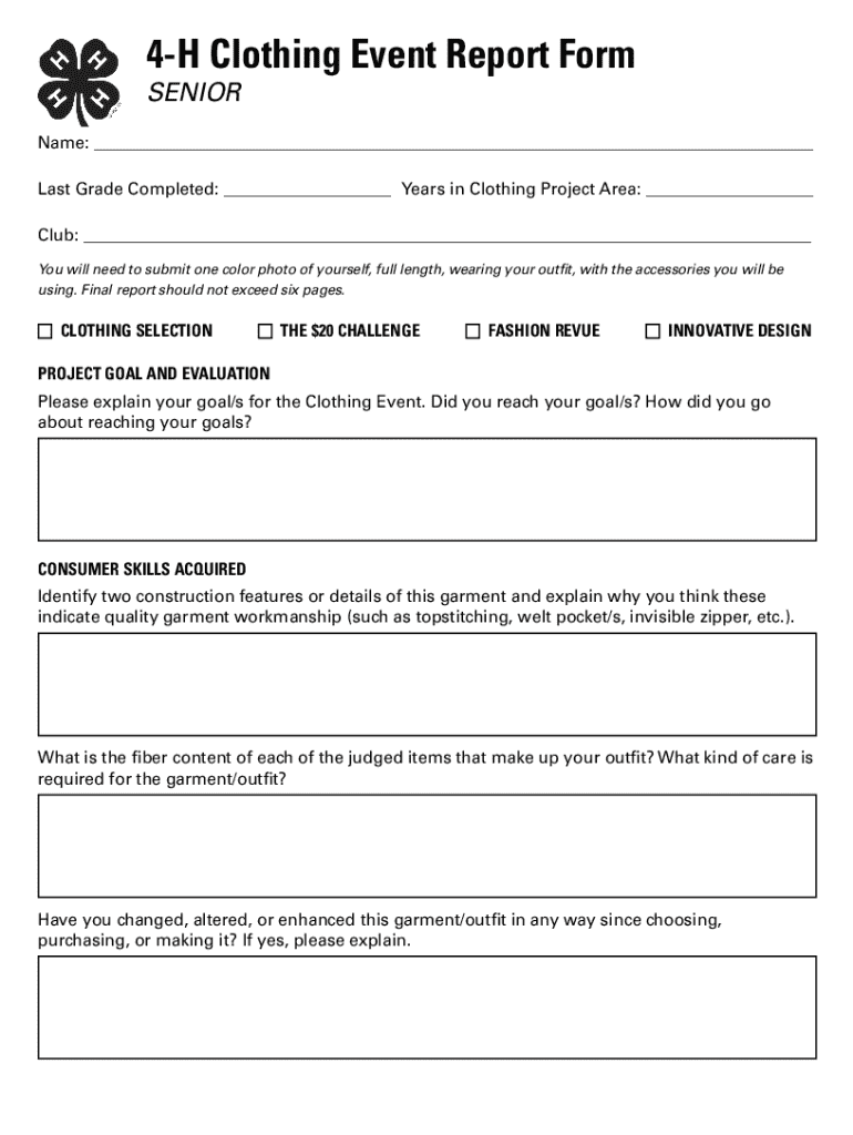 To fill out the 4-H Clothing Event Report, participants typically need to provide personal information, details about their clothing project, event participation, and any awards or recognitions received. Each section of the report should be completed with accurate and descriptive information.