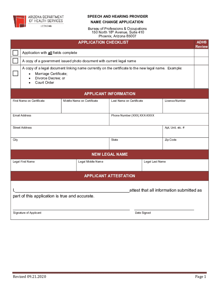 AZ Speech and Hearing Provider Name Change Application Form Versions