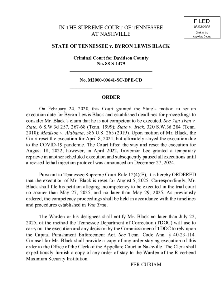 IN THE SUPREME COURT OF TENNESSEE AT NASHVILLE03/03/2025STATE OF TENNESSEE v. BYRON LEWIS BLACK Criminal Court for Davidson County No. 88S1479 ___ No. M200000641SCDPECD ___ORDER On February 24, 2020,