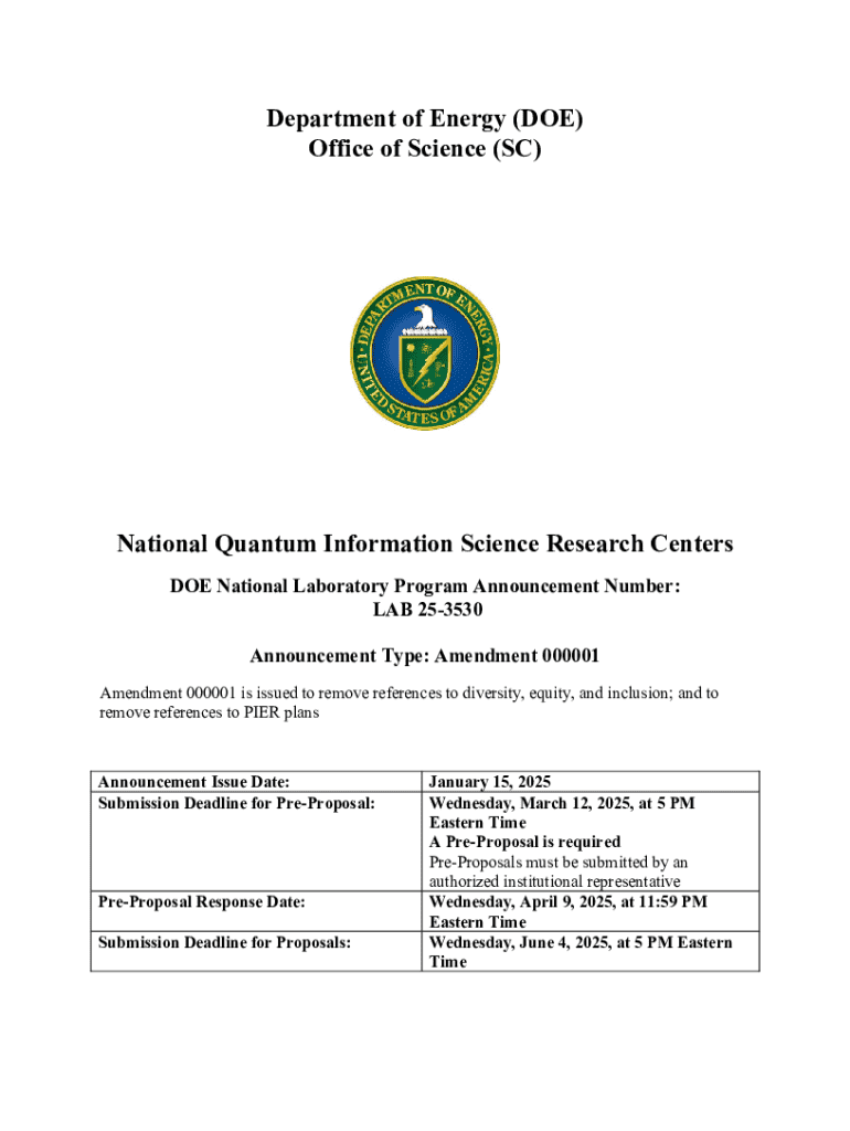 This announcement solicits proposals from multi-institutional, multidisciplinary teams to establish National Quantum Information Science Research Centers. It outlines eligibility requirements, funding