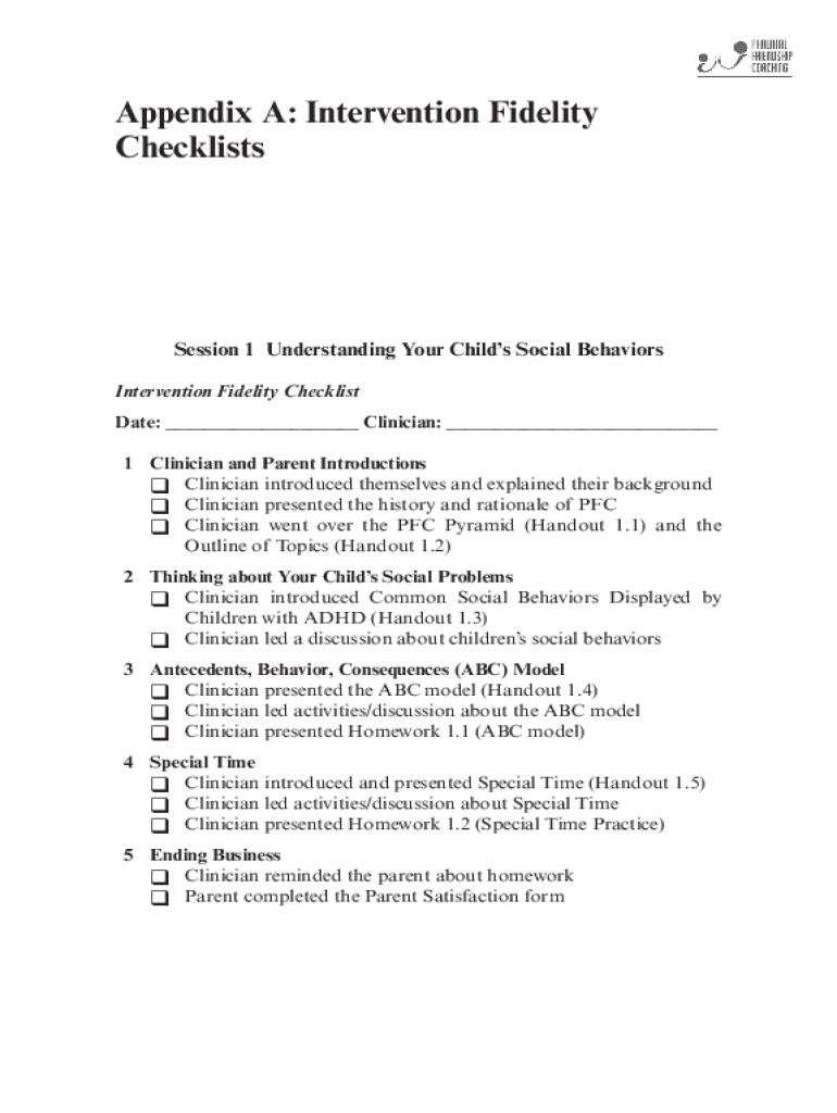 10Appendix A: Intervention Fidelity ChecklistsSession 1 Understanding Your Childs Social Behaviors Intervention Fidelity Checklist Date: ___ Clinician: ___ 1 Clinician and Parent Introductions Clinician
