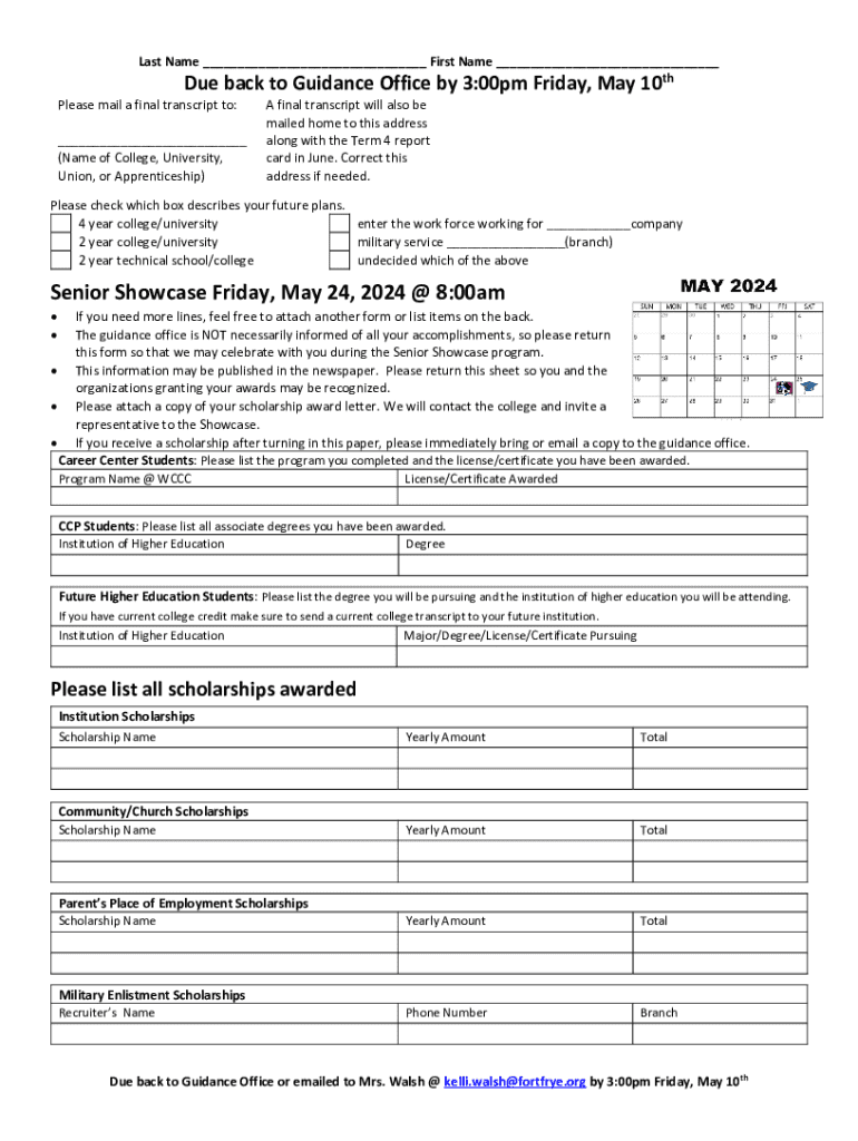 Last Name ___ First Name ___ thDue back to Guidance Office by 3:00pm Friday, May 10Please mail a final transcript to: ___ (Name of College, University, Union, or Apprenticeship)A final transcript