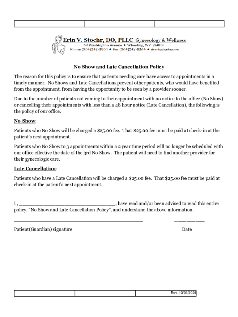 No Show and Late Cancellation Policy The reason for this policy is to ensure that patients needing care have access to appointments in a timely manner. No Shows and Late Cancellations prevent other