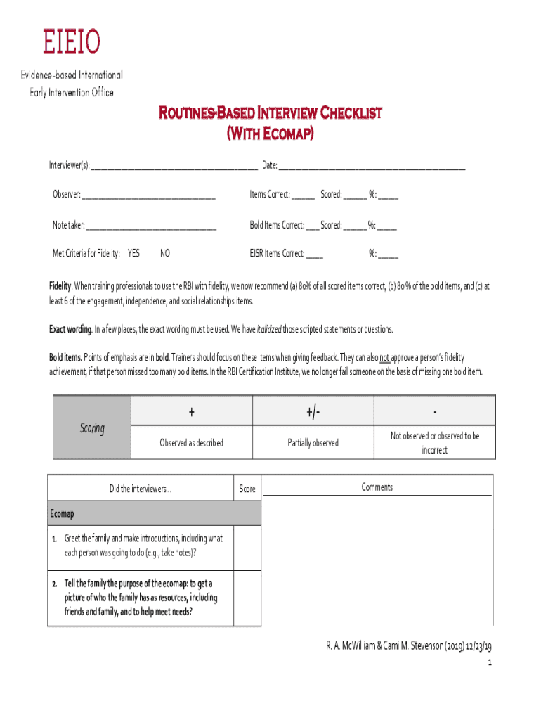 This checklist is designed to facilitate a routines-based interview to assess family dynamics and engagement in early intervention services. It includes guidelines for interviewers to collect relevant