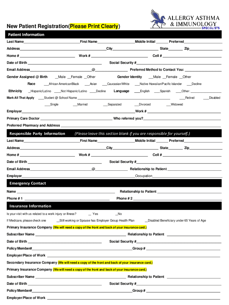 This document serves as a registration form for new patients, collecting essential personal and medical information, including demographics, contact details, insurance information, and consent for