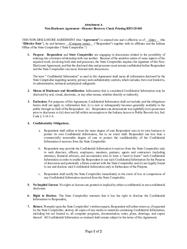 This Non-Disclosure Agreement is entered into for discussions regarding a potential business relationship between the Respondent and the Indiana Office of the State Comptroller, protecting the confidentiality