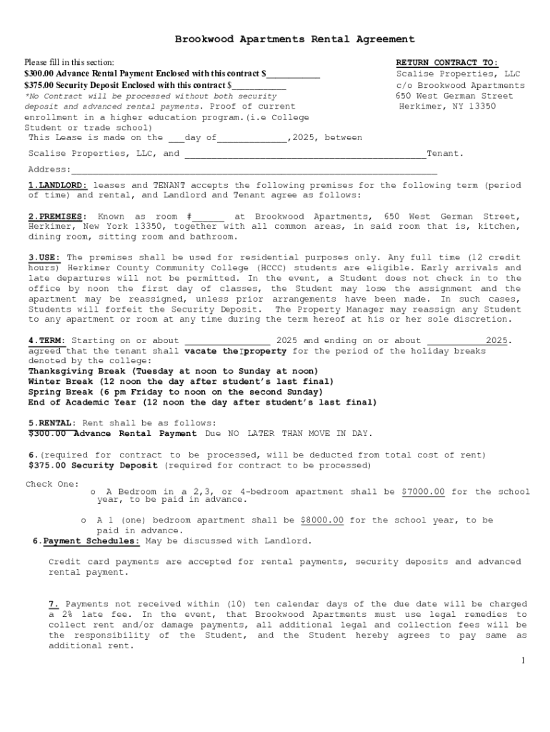 To fill out the Brookwood Apartments rental agreement, the landlord should provide accurate information regarding the property, including address and rental terms. The tenant must then enter their personal information, including name and contact details, and sign the agreement to indicate their acceptance.