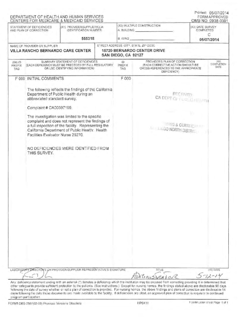 This document summarizes the findings of an abbreviated standard survey conducted by the California Department of Public Health at Villa Rancho Bernardo Care Center, identifying any deficiencies and