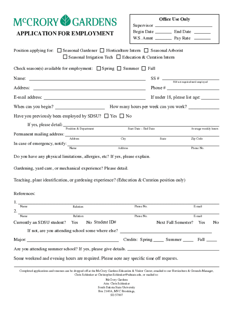 This document is an application form for various seasonal employment positions at South Dakota State University, including roles such as Seasonal Gardener, Horticulture Intern, Seasonal Arborist,