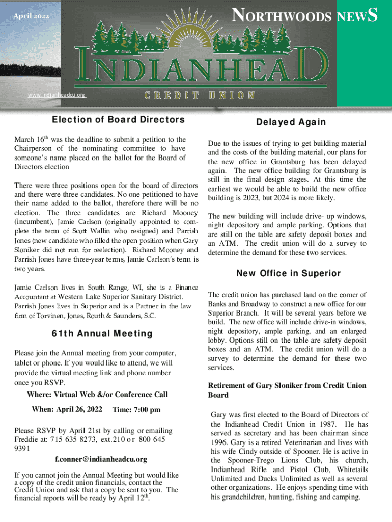 This document provides updates on the Indianhead Credit Union, including the election of board directors, details about the annual meeting, news on new office constructions, and retirement announcements.