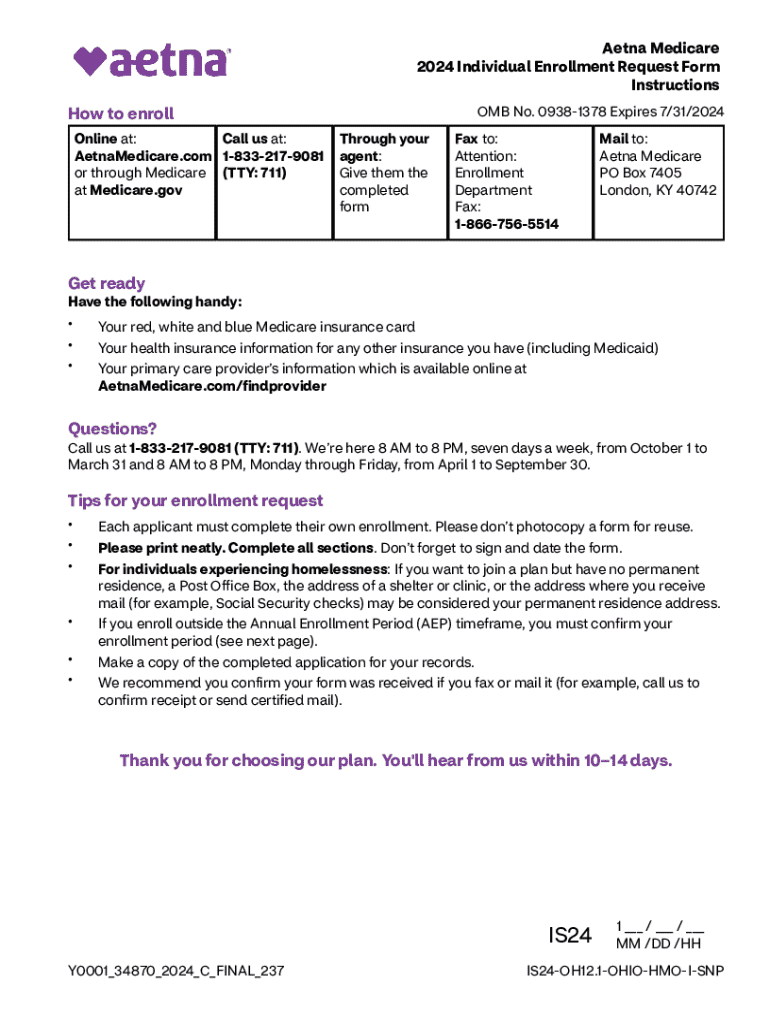 Get the free Aetna Medicare 2024 Individual Enrollment Request Form