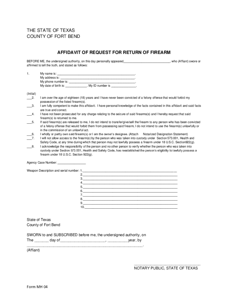 Este documento es un affidavit por el cual una persona solicita la devolución de un arma de fuego, declarando que no ha sido condenada por un delito que impida la posesión del arma.