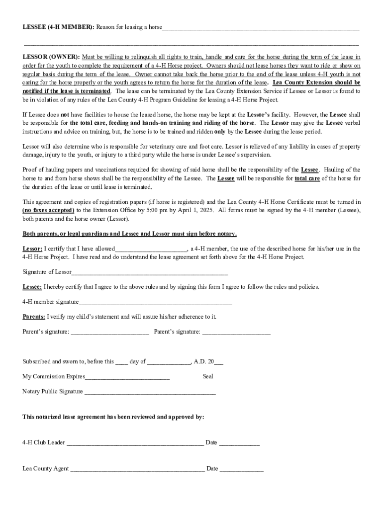 LESSEE (4H MEMBER): Reason for leasing a horse___ ___ LESSOR (OWNER): Must be willing to relinquish all rights to train, handle and care for the horse during the term of the lease in order for the