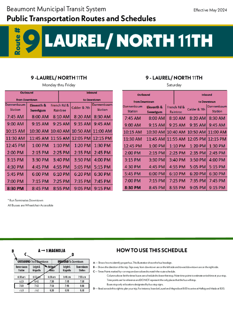 This document provides information about the Beaumont Municipal Transit System\'s Route 9, detailing schedules, fare information, paratransit services, and guidelines for using the transit system.