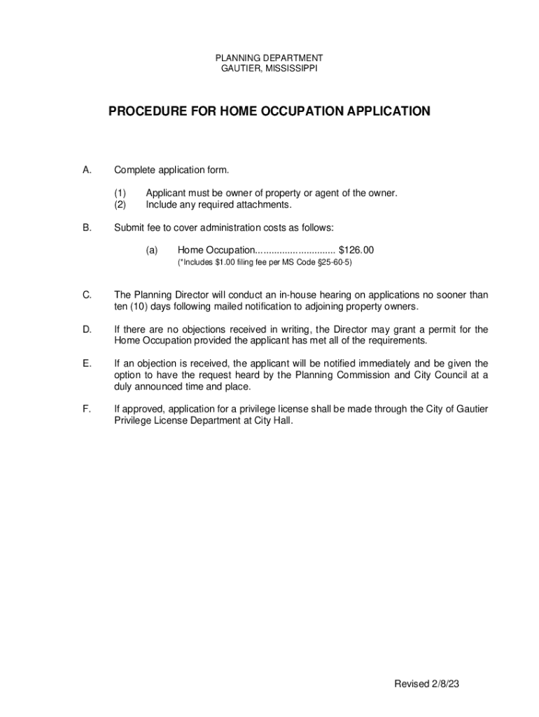 This document outlines the procedure for applying for a Home Occupation permit in Gautier, Mississippi. It includes details on application requirements, fees, and regulations governing home occupations.