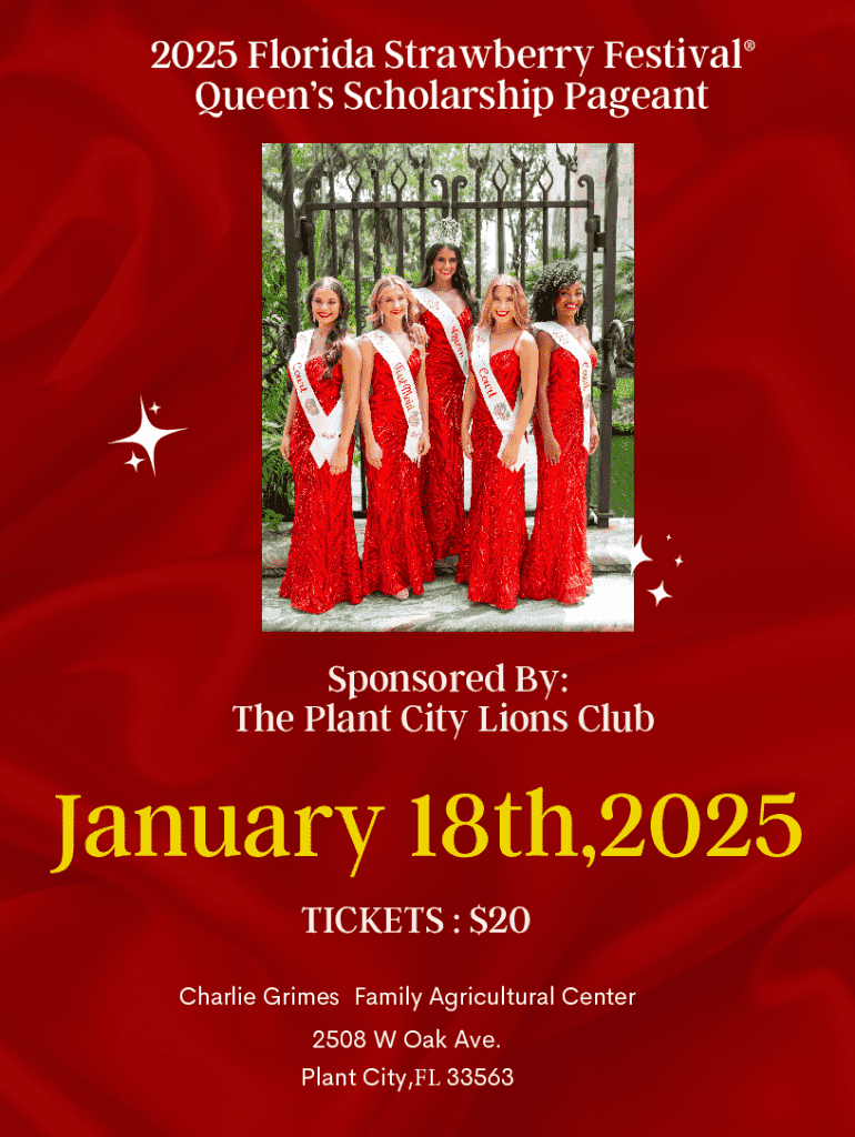 This document outlines the rules, regulations, and application process for the 2025 Florida Strawberry Festival® Queen’s Scholarship Pageant, sponsored by the Plant City Lions Club. It includes