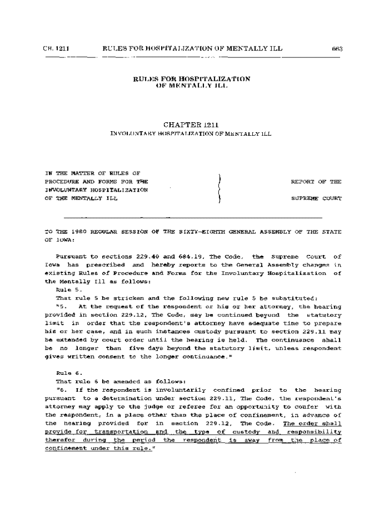 CH.1211RULES FOR HOSPITALIZATION OF MENTALLY ILL663RULES FOR HOSPITALIZATION OF MENTALLY ILLCHAPTER 1211 INVOLUNTARY HOSPITALIZATION OF MENTALLY ILLIN THE MATTER OF RULES OF PROCEDURE AND FORMS FOR