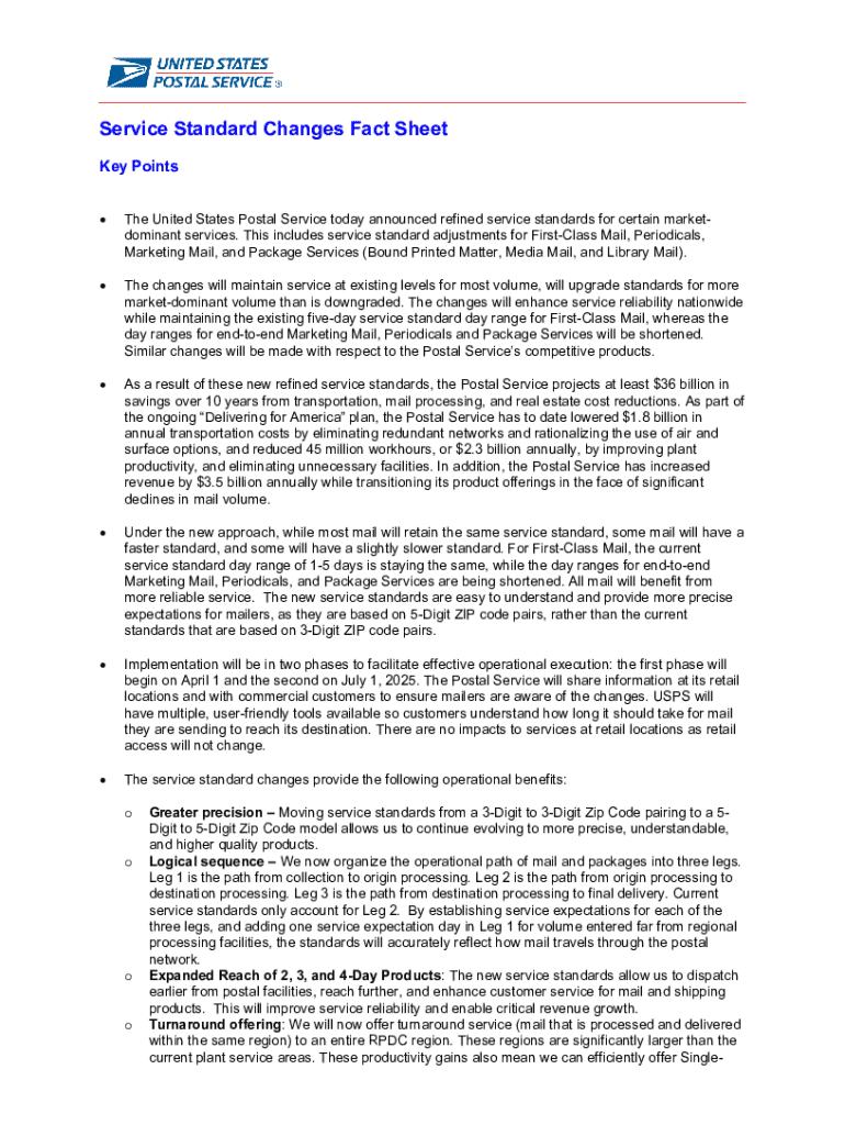 Service Standard Changes Fact Sheet Key Points The United States Postal Service today announced refined service standards for certain marketdominant services. This includes service standard adjustments