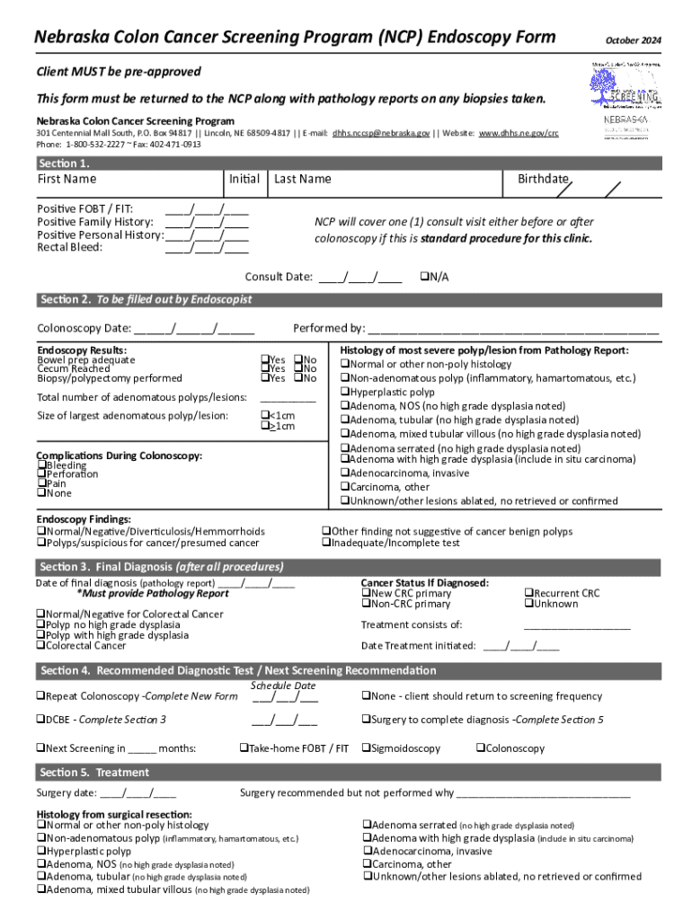 Form required for the Nebraska Colon Cancer Screening Program, detailing information on the client\'s screening, diagnosis, and treatment related to colon cancer.