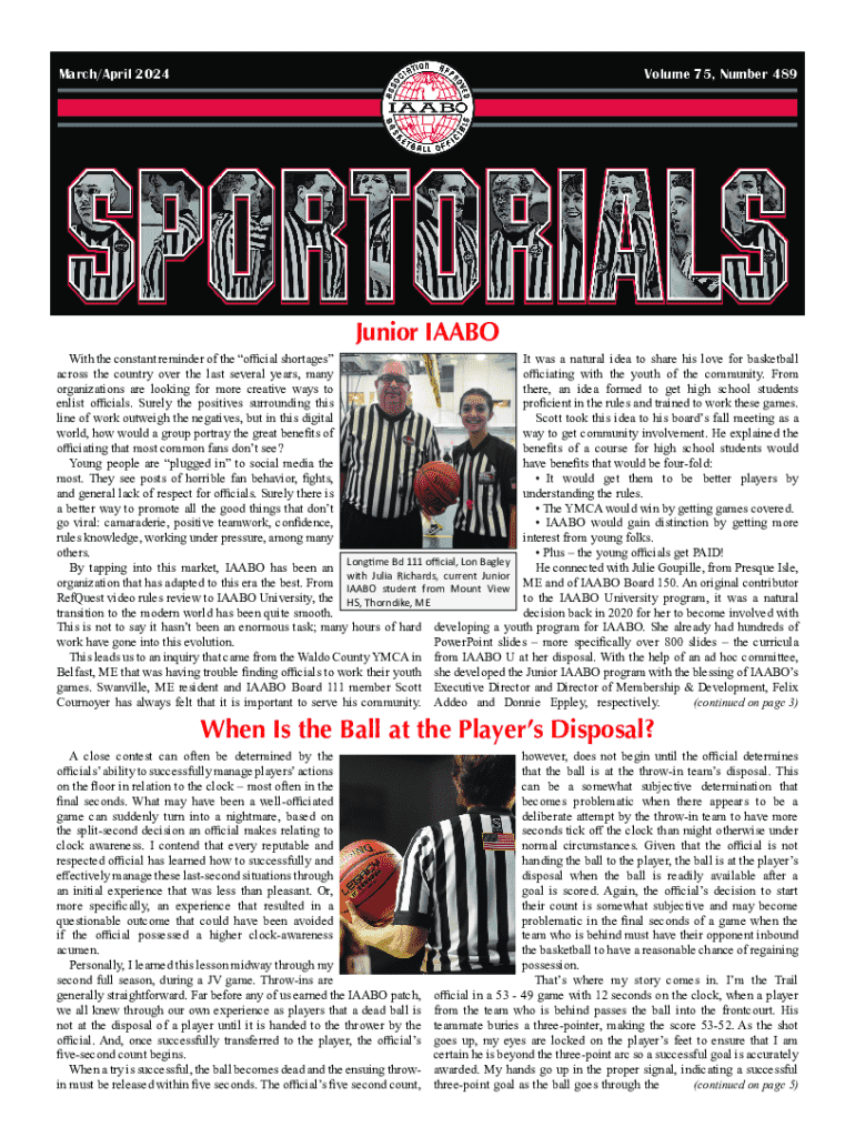 March/April 2024Volume 75, Number 489Junior IAABO With the constant reminder of the official shortages It was a natural idea to share his love for basketball across the country over the last several