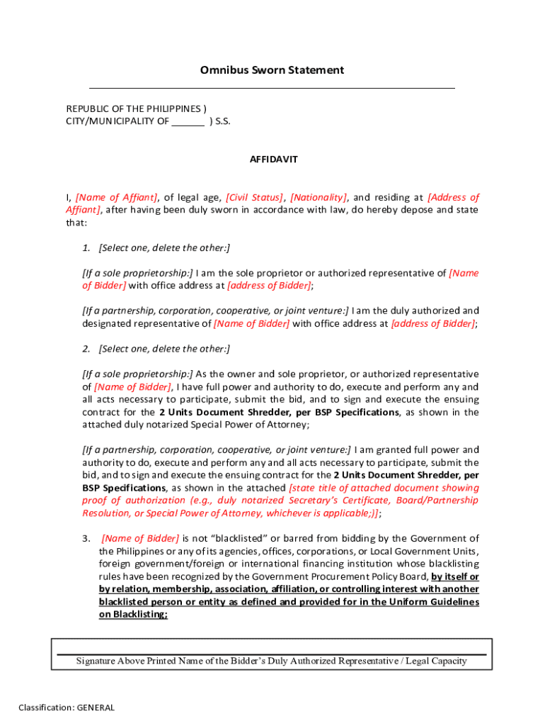 Ang Omnibus Sworn Statement ay isang legal na dokumento na nagsasaad ng mga deklarasyon mula sa isang affiant patungkol sa awtoridad na lumahok sa bidding, pagkilala sa mga impormasyon na ibinigay,