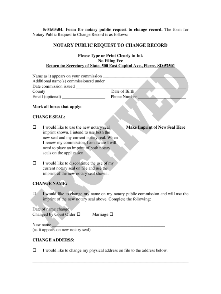 This form is used by notaries public to request changes to their record, including changes to their seal, name, and address. It requires specific information about the notary\'s commission and a declaration