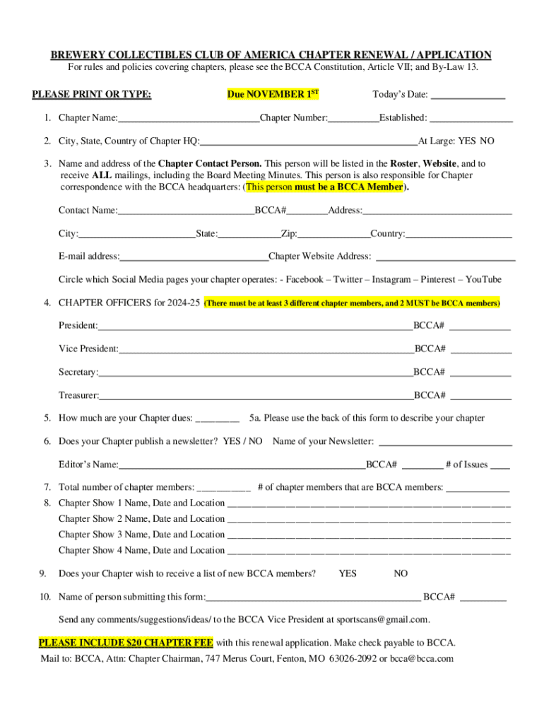 This form is used for renewing or applying for a chapter in the Brewery Collectibles Club of America. It collects information about the chapter including contact details, officers, dues, memberships,