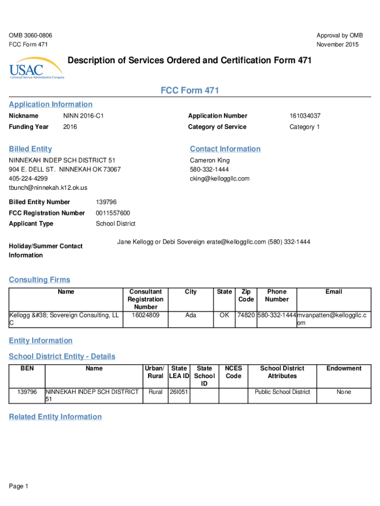 Descripción de servicios ordenados y certificación para la solicitud de financiación para el año escolar 2016, incluyendo detalles sobre el distrito escolar, entidades relacionadas, y solicitudes