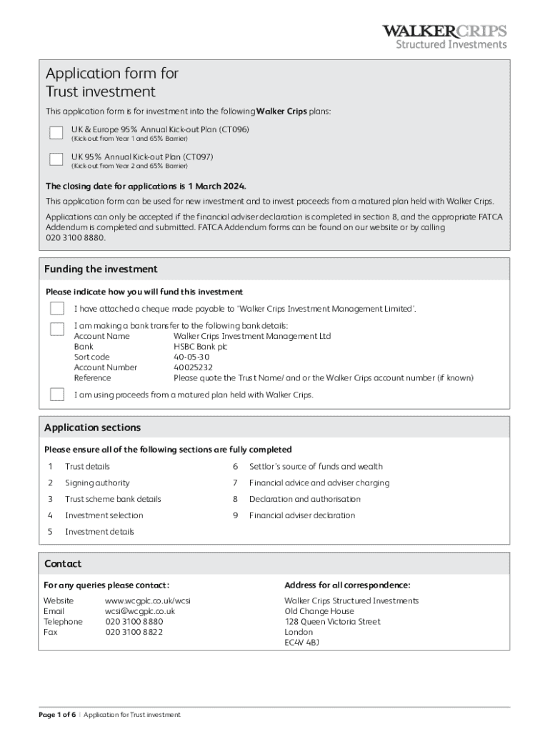 This application form is for investment into various Walker Crips plans, including the UK & Europe 95% Annual Kick-out Plan (CT096) and the UK 95% Annual Kick-out Plan (CT097). It provides details