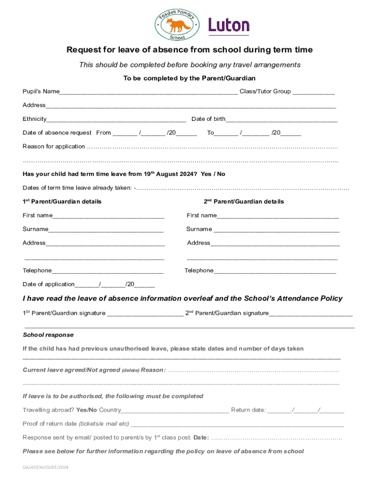 Request for leave of absence from school during term time This should be completed before booking any travel arrangements To be completed by the Parent/Guardian Pupils Name___ Class/Tutor Group ___
