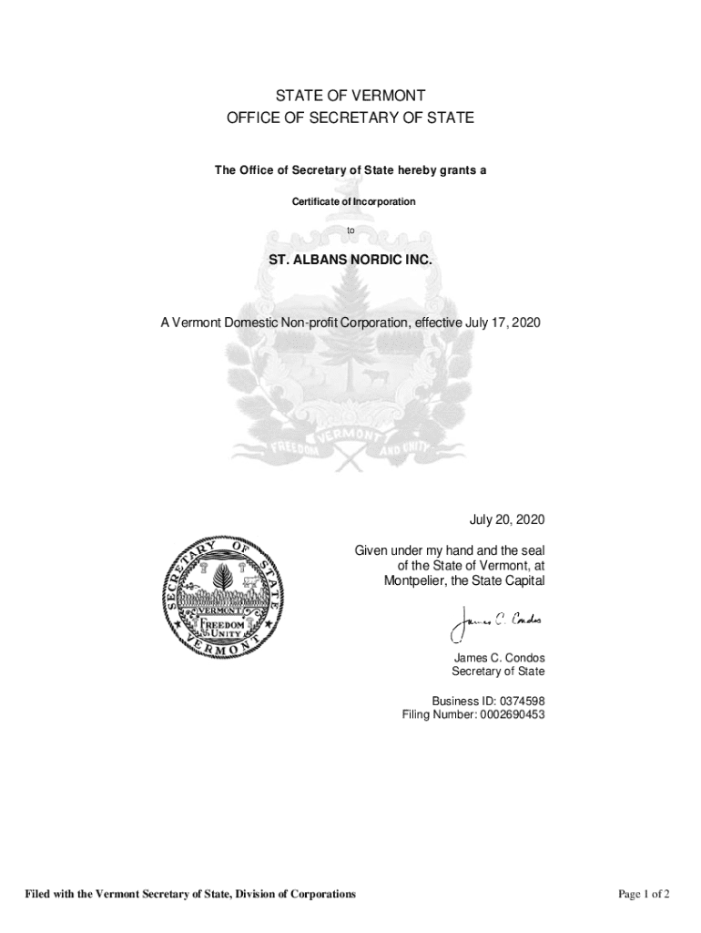 STATE OF VERMONT OFFICE OF SECRETARY OF STATEThe Office of Secretary of State hereby grants a Certificate of Incorporation toST. ALBANS NORDIC INC.A Vermont Domestic Nonprofit Corporation, effective