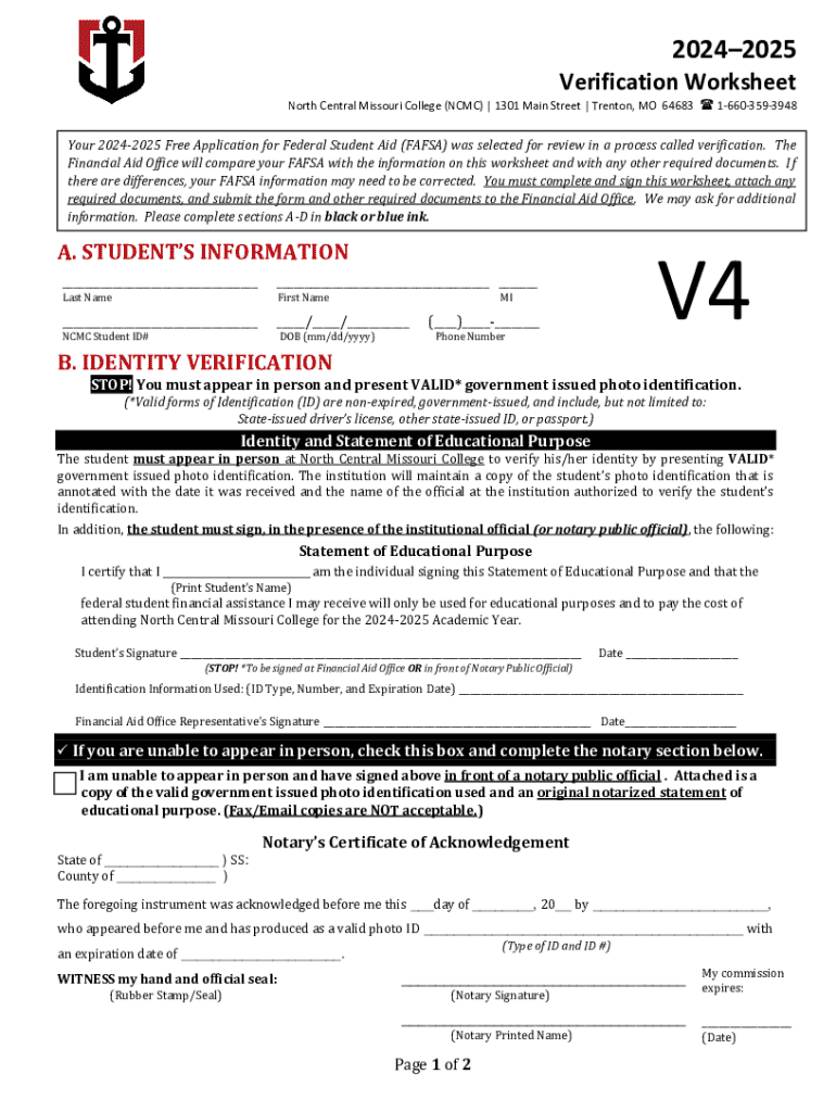 A verification worksheet is a document used in the financial aid process to confirm and verify the information provided on the Free Application for Federal Student Aid (FAFSA). It ensures that the data is accurate and complete.