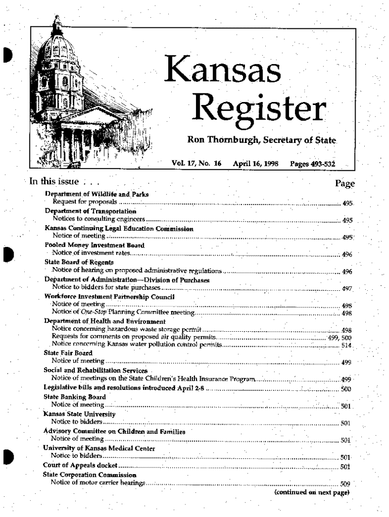 In this issuePageDepartment of Wildlife and Parks Department of Transportation Notices to consulting engineers Kansas Continuing Legal Education Commission Notice of meeting Pooled Money lnvestment