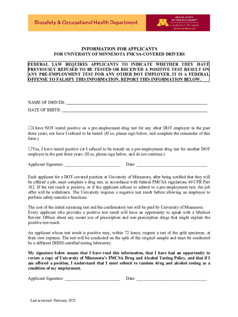 INFORMATION FOR APPLICANTSFOR UNIVERSITY OF MINNESOTA FMCSACOVERED DRIVERS FEDERAL LAW REQUIRES APPLICANTS TO INDICATE WHETHER THEY HAVE PREVIOUSLY REFUSED TO BE TESTED OR RECEIVED A POSITIVE TEST