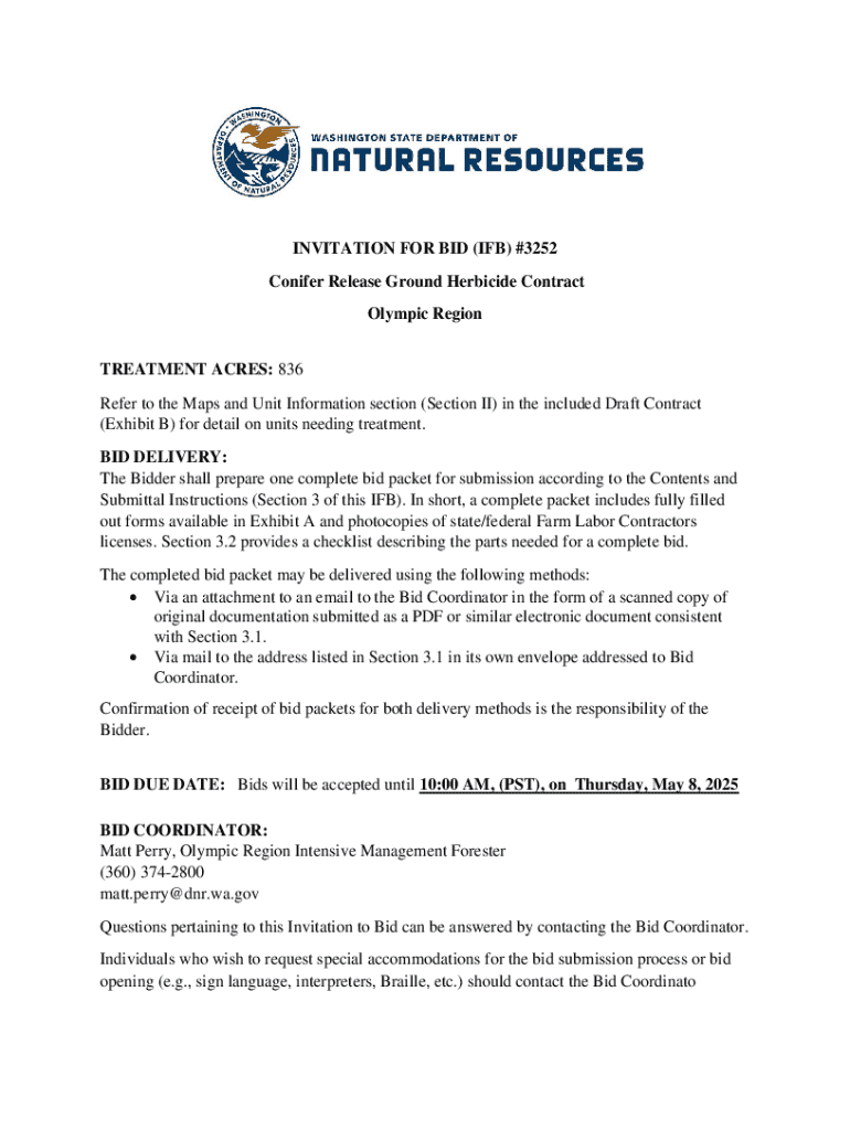 This document outlines the solicitation for bids for ground herbicide application services in the Olympic Region, covering specific treatment areas and detailing the bidding process and requirements