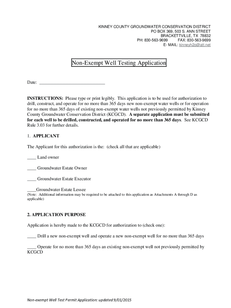 To fill out a non-exempt well testing application, applicants should provide accurate information regarding the well location, ownership details, type of testing to be conducted, and any other supporting documentation required by the regulatory body. It's important to follow the specific form guidelines outlined by the authority.