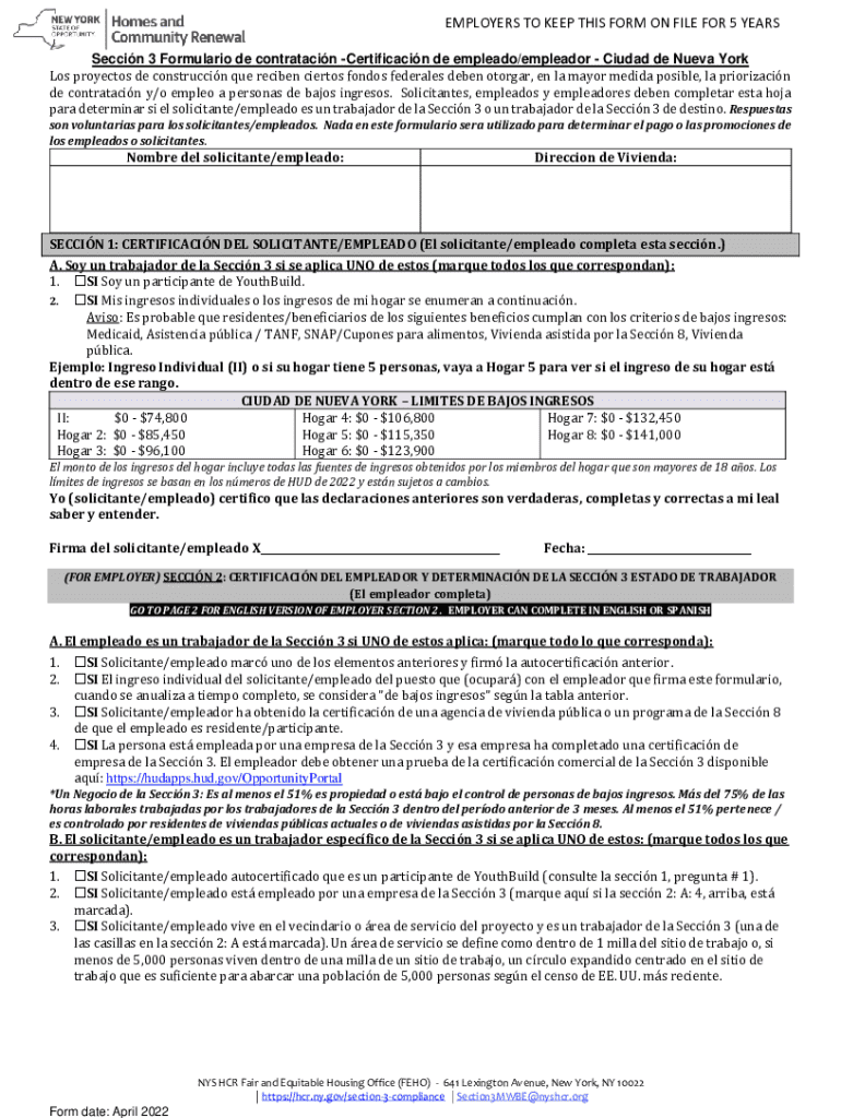 Este formulario debe ser completado por solicitantes, empleados y empleadores para determinar si el solicitante/empleado es un trabajador de la Sección 3 o un trabajador de la Sección 3 de destino,