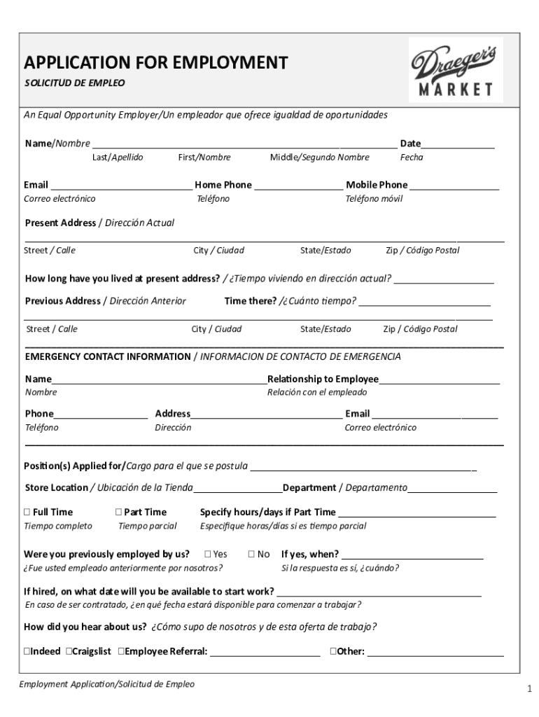 Esta es una solicitud de empleo que recolecta información personal del solicitante, historial laboral, educación y referencias. Incluye información sobre oportunidades de igualdad y la política