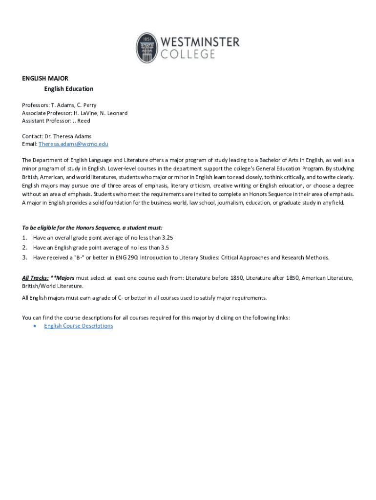 ENGLISH MAJOR English Education Professors: T. Adams, C. Perry Associate Professor: H. LaVine, N. Leonard Assistant Professor: J. Reed Contact: Dr. Theresa Adams Email: Theresa.adams@wcmo.edu The