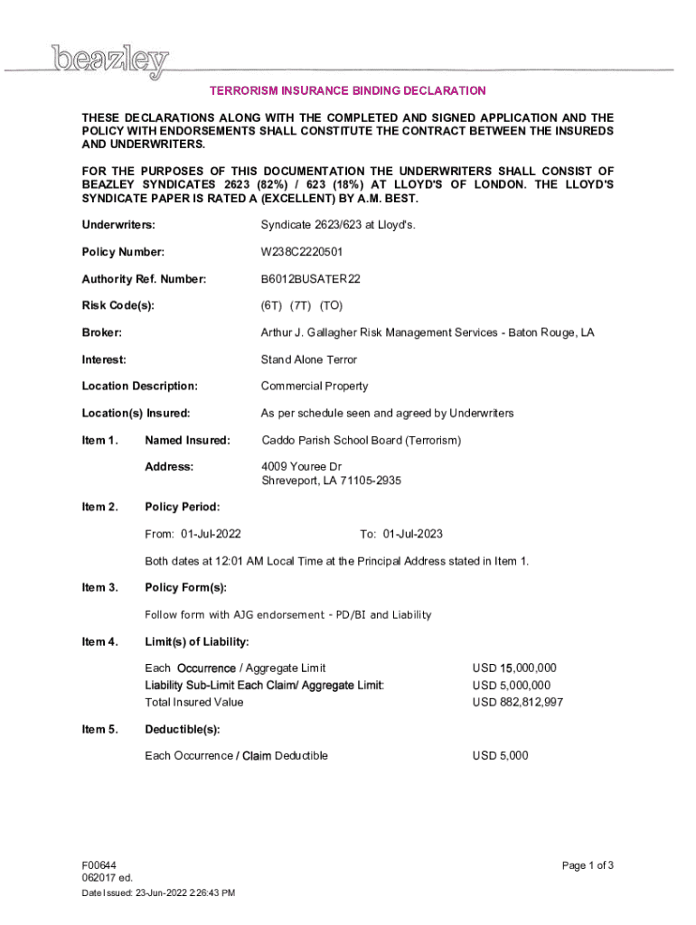 This binding declaration outlines the terrorism insurance policy terms, including underwriter details, policy limits, and conditions associated with coverage against acts of terrorism.