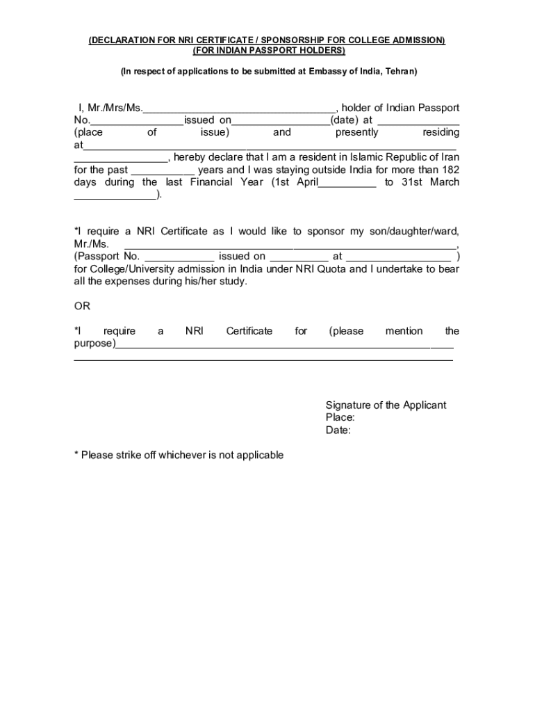 This document is a declaration for Indian passport holders residing in the Islamic Republic of Iran, requiring an NRI Certificate to sponsor their child for college admission in India under the NRI