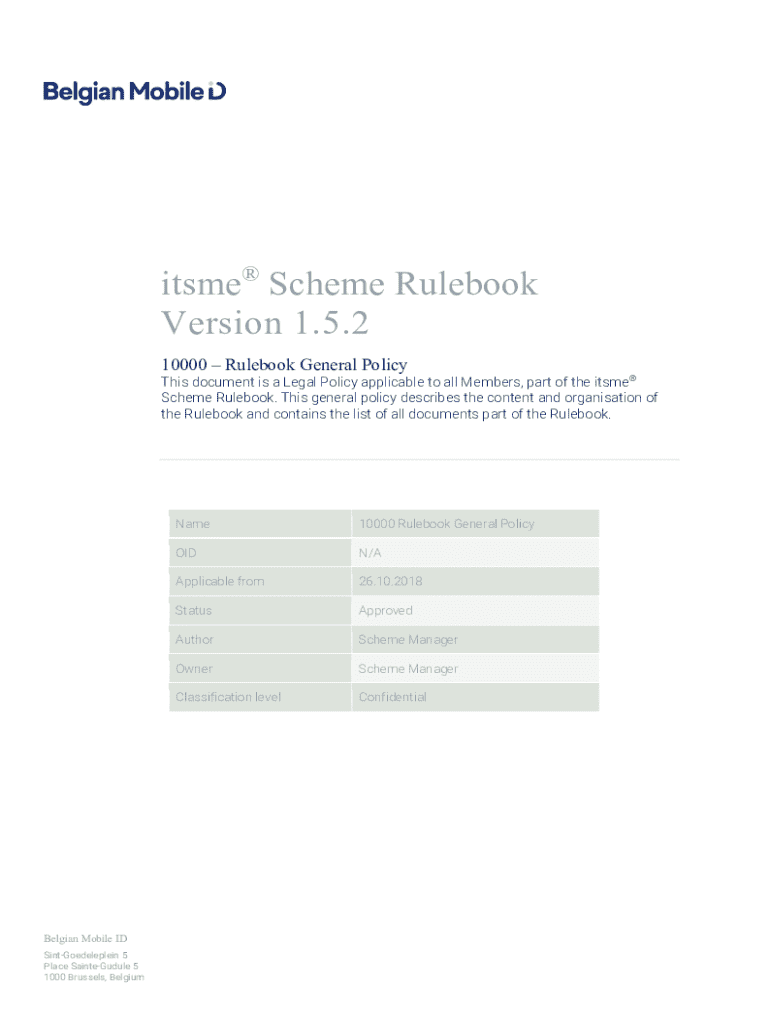 Este documento es una Política Legal aplicable a todos los Miembros, parte del Rulebook del esquema itsme®. Esta política general describe el contenido y la organización del Rulebook y contiene