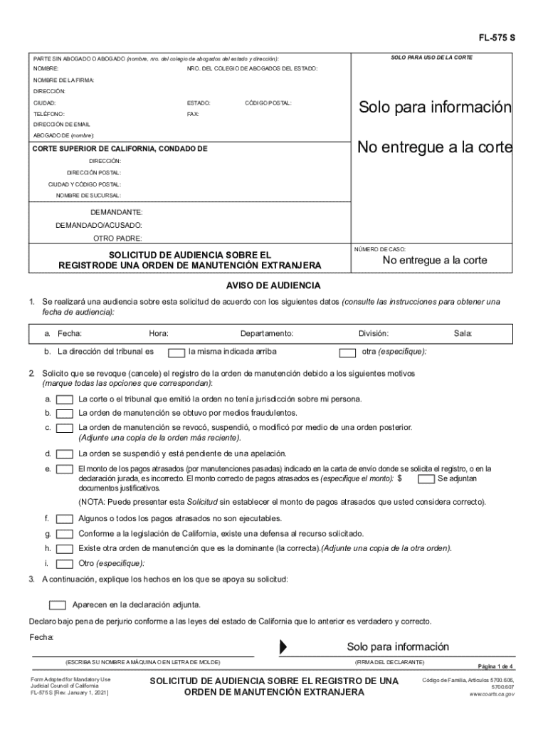 Para completar el formulario FL-575 S, es necesario proporcionar información personal, detalles sobre ingresos y gastos, así como datos sobre los beneficiarios de la obligación alimentaria.