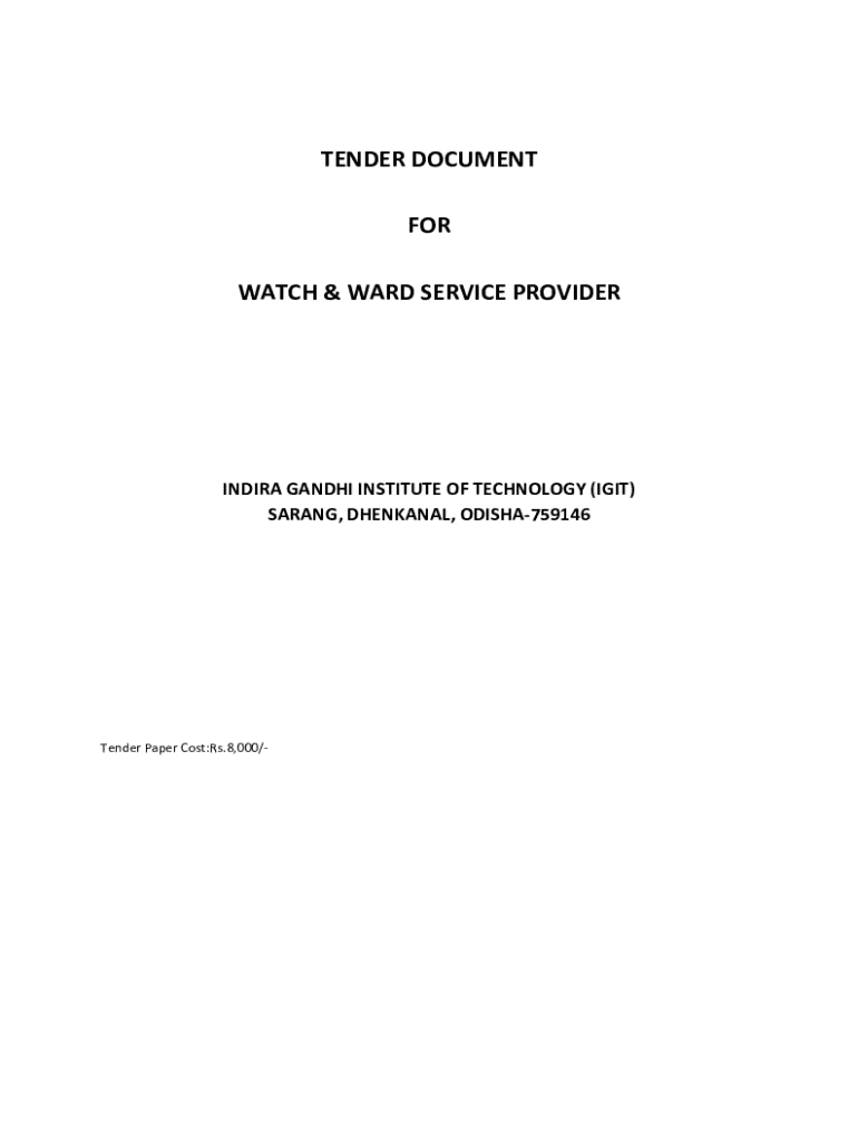TENDER DOCUMENT FOR WATCH & WARD SERVICE PROVIDERINDIRA GANDHI INSTITUTE OF TECHNOLOGY (IGIT) SARANG, DHENKANAL, ODISHA759146Tender Paper Cost:Rs.8,000/INDIRA GANDHI INSTITUTE OF TECHNOLOGY (IGIT)