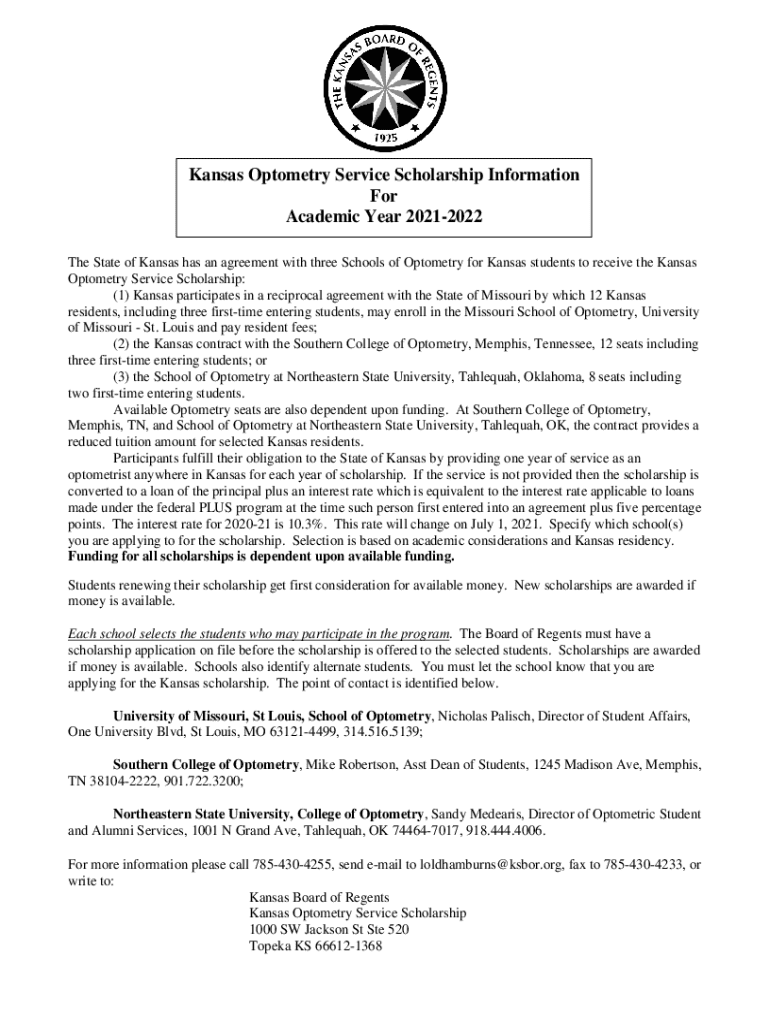 This document provides information regarding the Kansas Optometry Service Scholarship for the academic year 2021-2022, including eligibility criteria, application details, participating schools, and