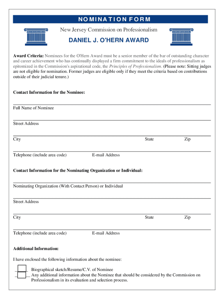 Formulario de nominación para el Premio Daniel J. O\'Hern otorgado por la Comisión de Profesionalismo de Nueva Jersey, dirigido a miembros destacados del bar que demuestran un compromiso con los