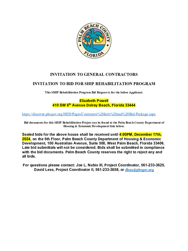 Este documento es una invitación para que los contratistas presenten una oferta para el Programa de Rehabilitación SHIP. Se describen los requisitos de la oferta y las especificaciones del trabajo,